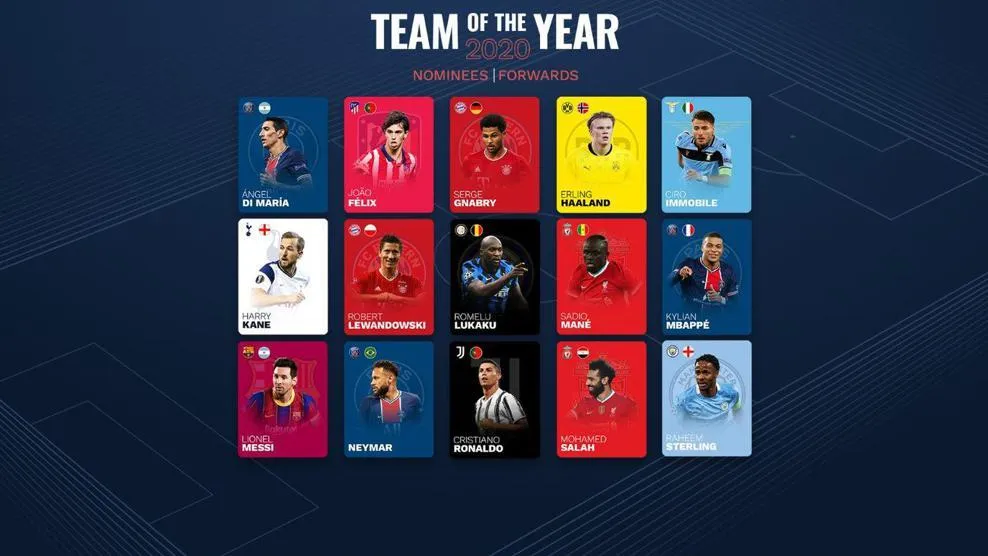 - Нападники: Ерлінг Холанд (Боруссія, Дортмунд), Анхель Ді Марія (ПСЖ), Жоау Фелікс (Атлетіко), Серж Гнабрі (Баварія), Чіро Іммобіле (Лаціо), Гаррі Кейн (Тоттенхем), Роберт Левандовскі (Баварія), Ромелу Лукаку (Інтер), Садьо Мане (Ліверпуль), Кіліан Мбаппе (ПСЖ), Ліонель Мессі (Барселона), Неймар (ПСЖ), Кріштіану Роналду (Ювентус), Мохамед Салах (Ліверпуль), Рахім Стерлінг (Манчестер Сіті).
