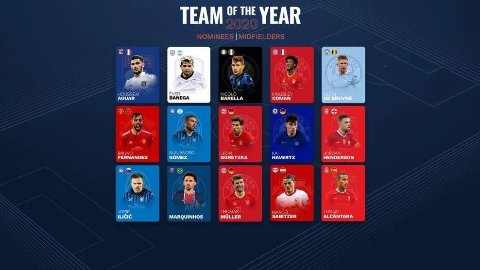 - Півзахисники: Тіаго Алькантара (Ліверпуль), Уссем Ауар (Ліон), Евер Банега (Аль-Шааб), Ніколо Барелла (Інтер), Кінгслі Коман (Баварія), Кевін де Брюйне (Манчестер Сіті), Бруну Фернандеш (Манчестер Юнайтед), Алехандро Гомес (Аталанта), Леон Горетцка (Баварія), Кай Хавертц (Челсі), Джордан Хендерсон (Ліверпуль), Йосип Ілічич (Аталанта), Маркіньос (ПСЖ), Томас Мюллер (Баварія), Марсель Забітцер (Лейпциг).