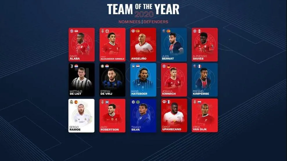 - Захисники: Давід Алаба (Баварія), Трент Александер-Арнолд (Ліверпуль), Анхеліньо (Лейпциг), Хуан Бернат (ПСЖ), Альфонсо Девіс (Баварія), Маттейс де Лігт (Ювентус), Стефан де Врей (Інтер), Ханс Хатебур (Аталанта), Йозуа Кімміх (Баварія), Преснель Кімпембе (ПСЖ), Серхіо Рамос (Реал), Ендрю Робертсон (Ліверпуль), Тіаго Сілва (Челсі), Дайо Упамекано (Лейпциг), Вірджіл ван Дейк (Ліверпуль).
