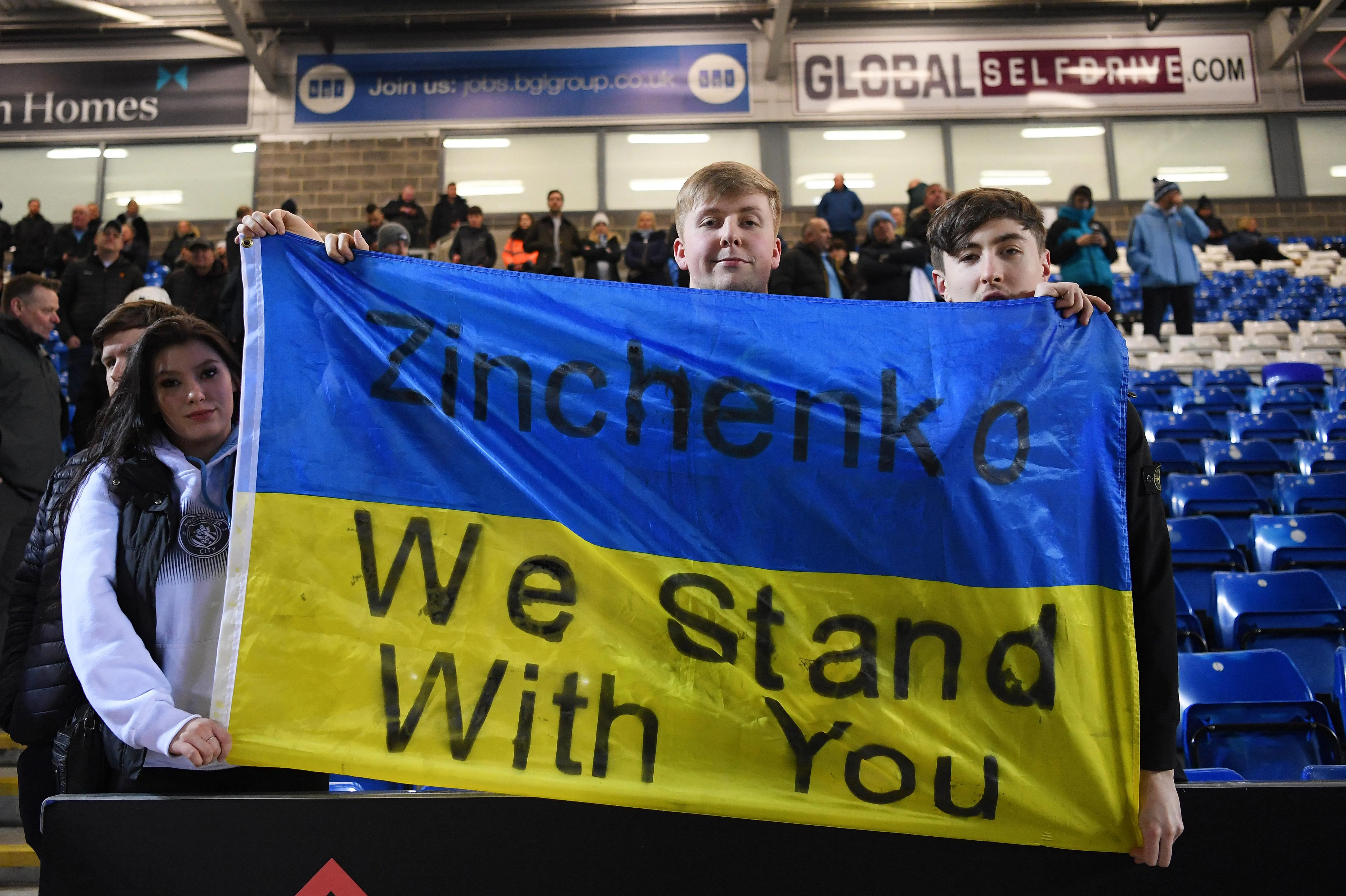 На трибунах було помітно чимало українських прапорів та плакатів зі словами підтримки.