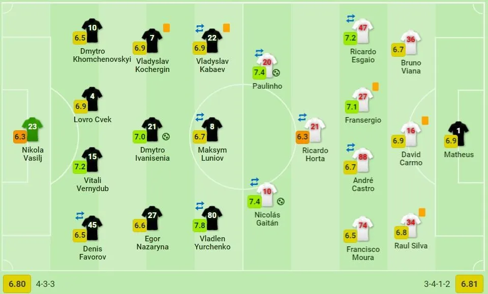 Найвищу оцінку у складі "Зорі" отримав півзахисник Владлен Юрченко – 7,8. Його бал став найкращим серед всіх гравців, які брали участь у матчі у складі обох команд.